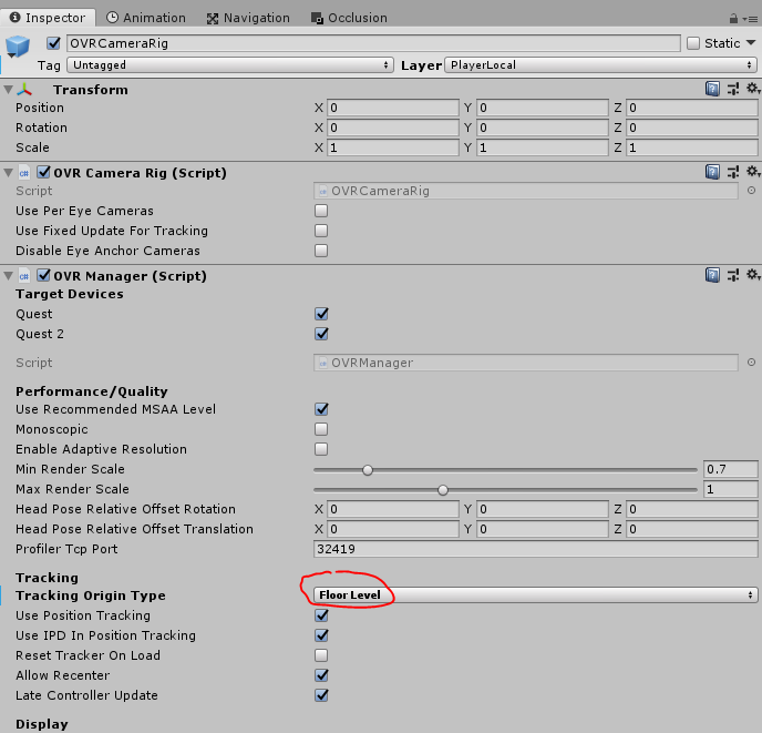 개꾸진 SnapRotation과 하위의 OVRCameraRig에서 Tracking Origin Type을 Floor Level로 바꿔주자