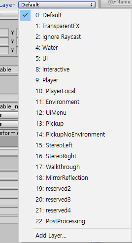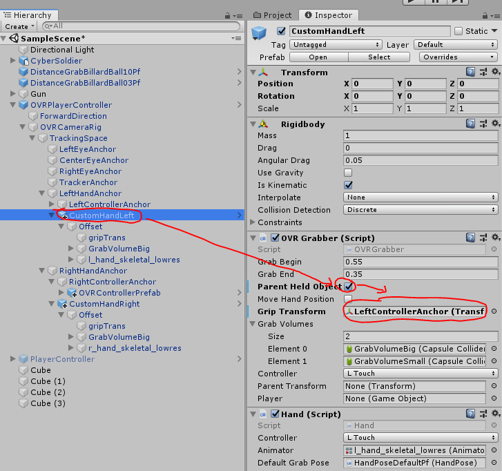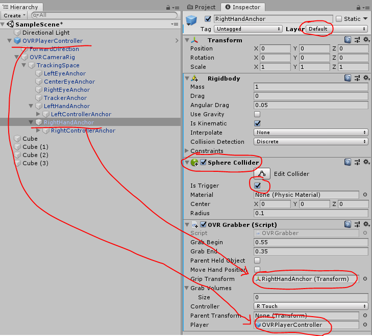 OVR Grabber : 픽업기능의 손에 해당하는부분. Layer는 Default여야하고(간섭가능) 콜라이더가 붙어있어야 하며