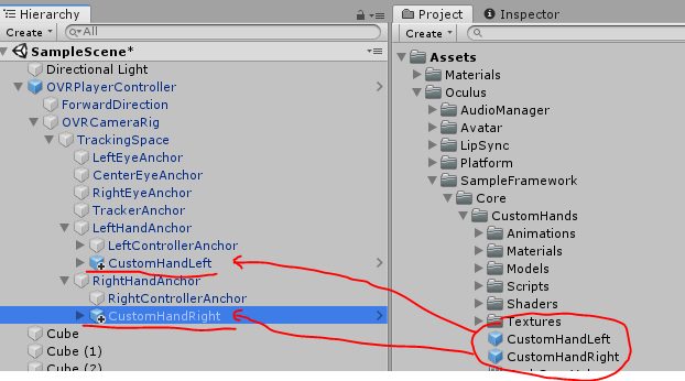 CustomHandLeft : 손위치를 표시해주는 프리팹(손모양), OVRCustomHandPrefab이랑 헷갈리지 않게 주의
