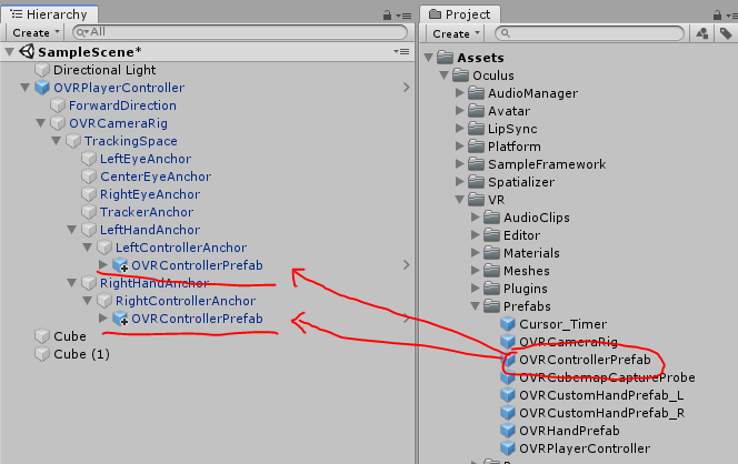 OVRControllerPrefab : 손위치를 표시해주는 프리팹(컨트롤러모양), 필수는 아니지만 있으면 좋음. 옵션은 L Touch, R Touch 쓰자